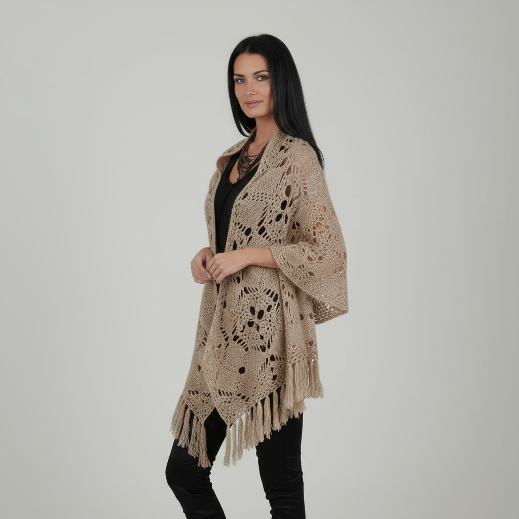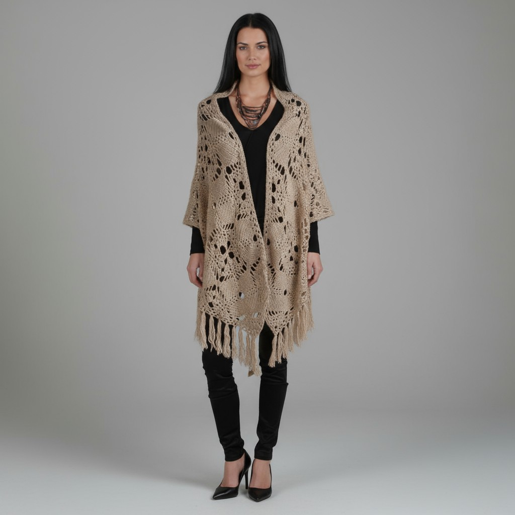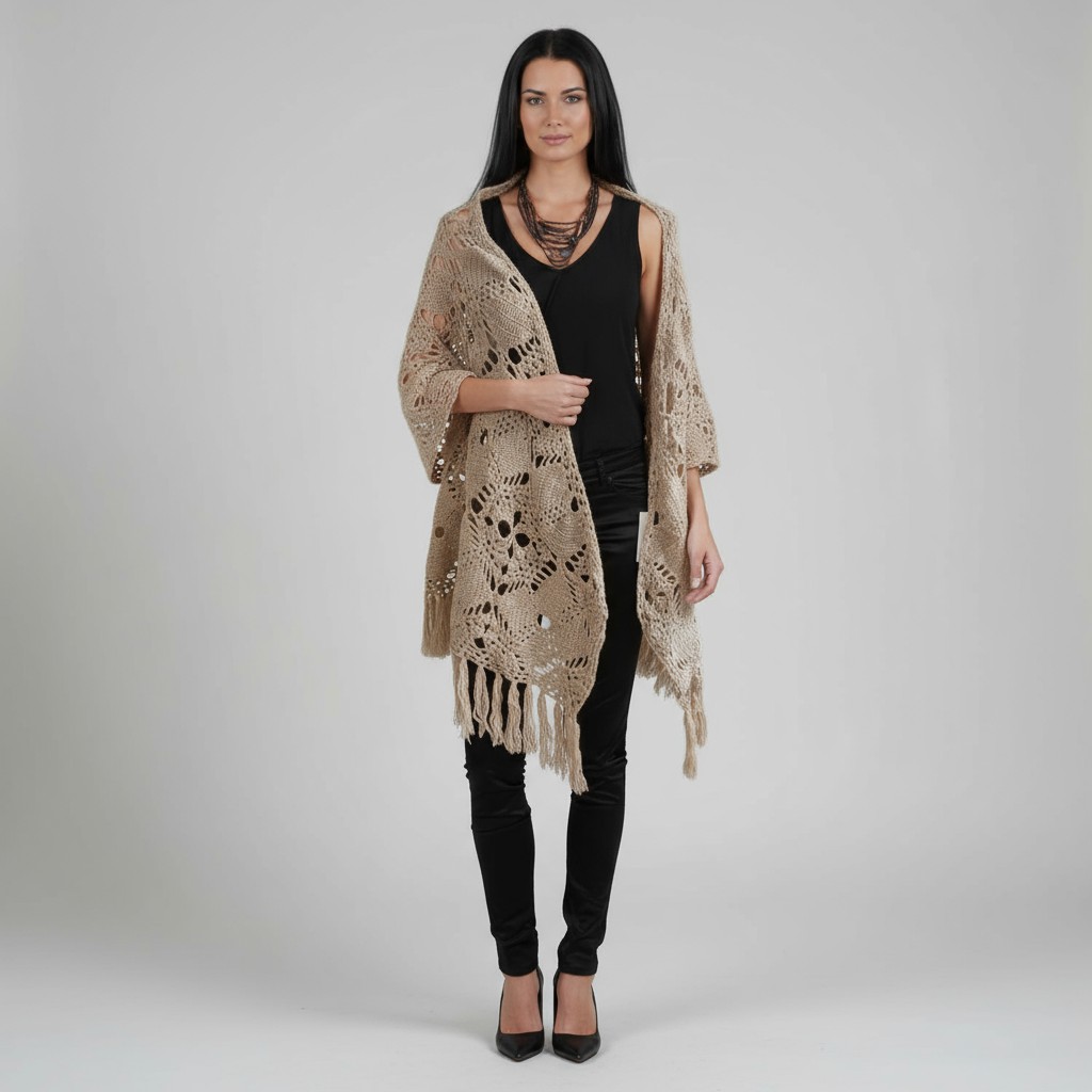 This beautiful hand made, crocheted shawl is true modern, unique, made of Italian yarn - Lambs wool. With the fringe bottom and hand crafted pattern, its beauty is undeniable.