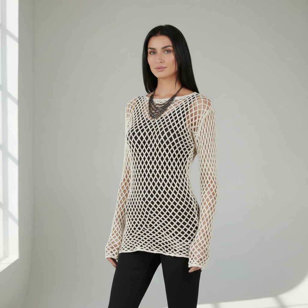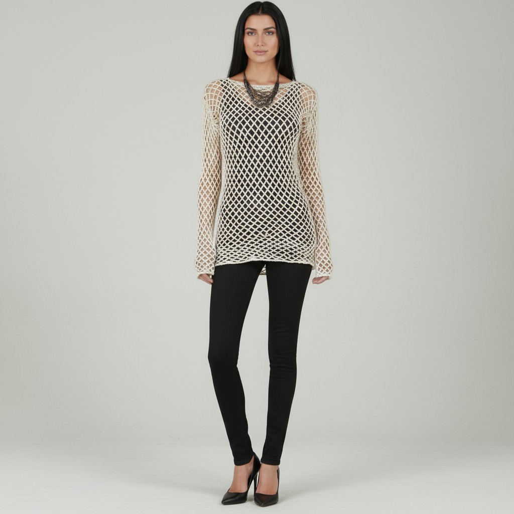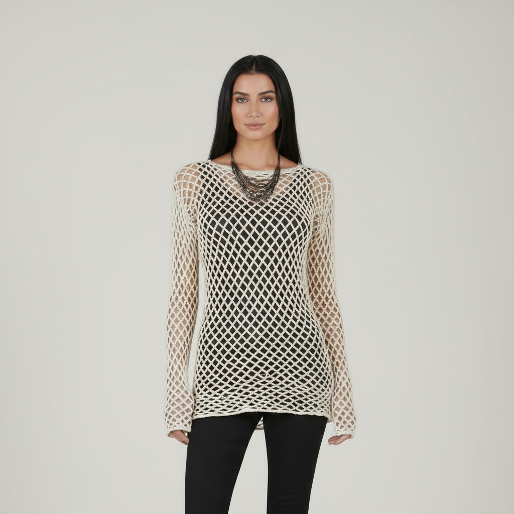 This Fish-Net Crocheted Top is off-white in color and great for any season. The crocheted top has flared out long sleeves, fishnet pattern and handmade lace around the neck, sleeves and hem. It is light and carefree, ideal for layering. Made of Italian wool, It is pair-able with just about anything and will rock the fashion world.