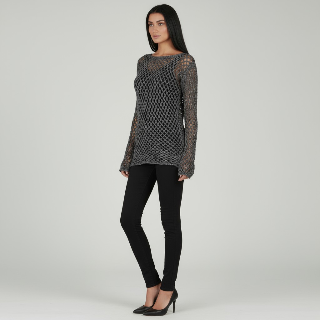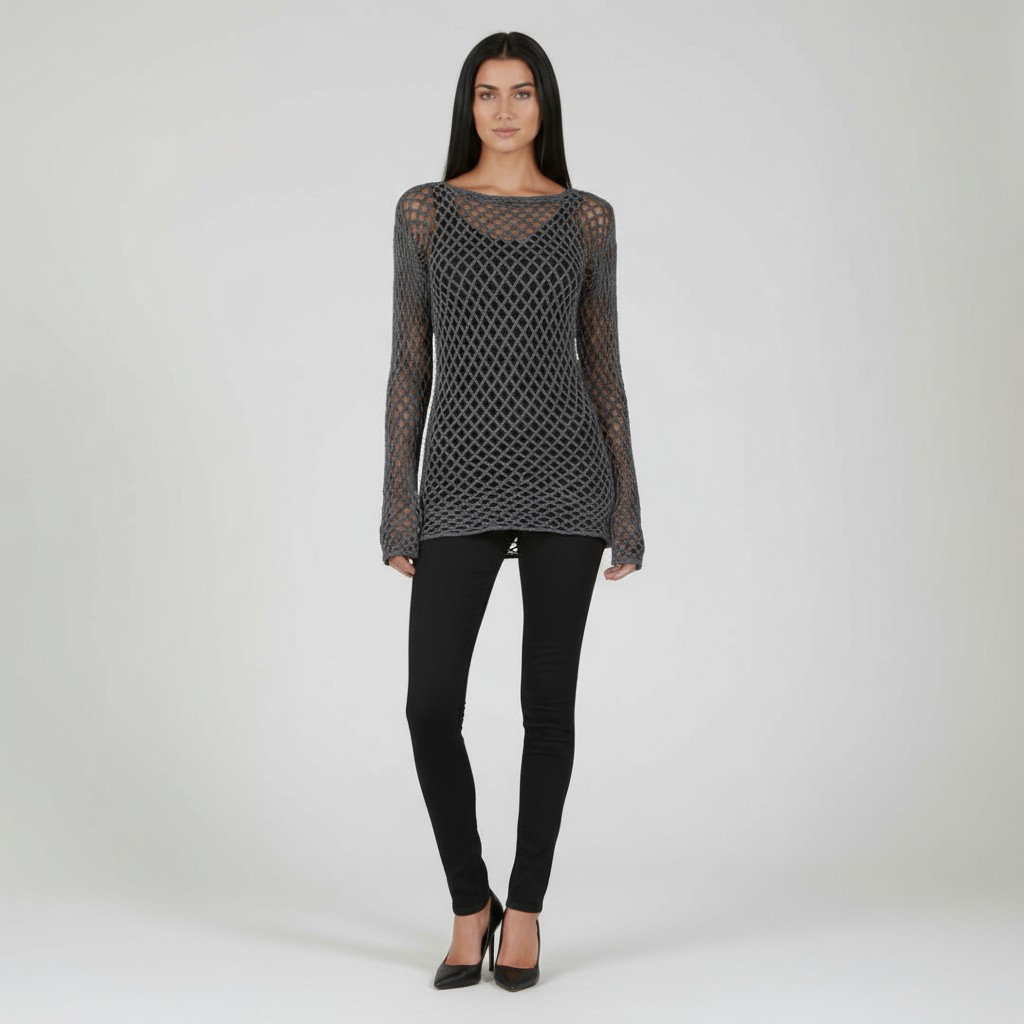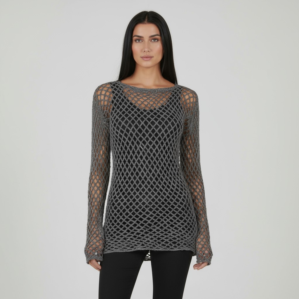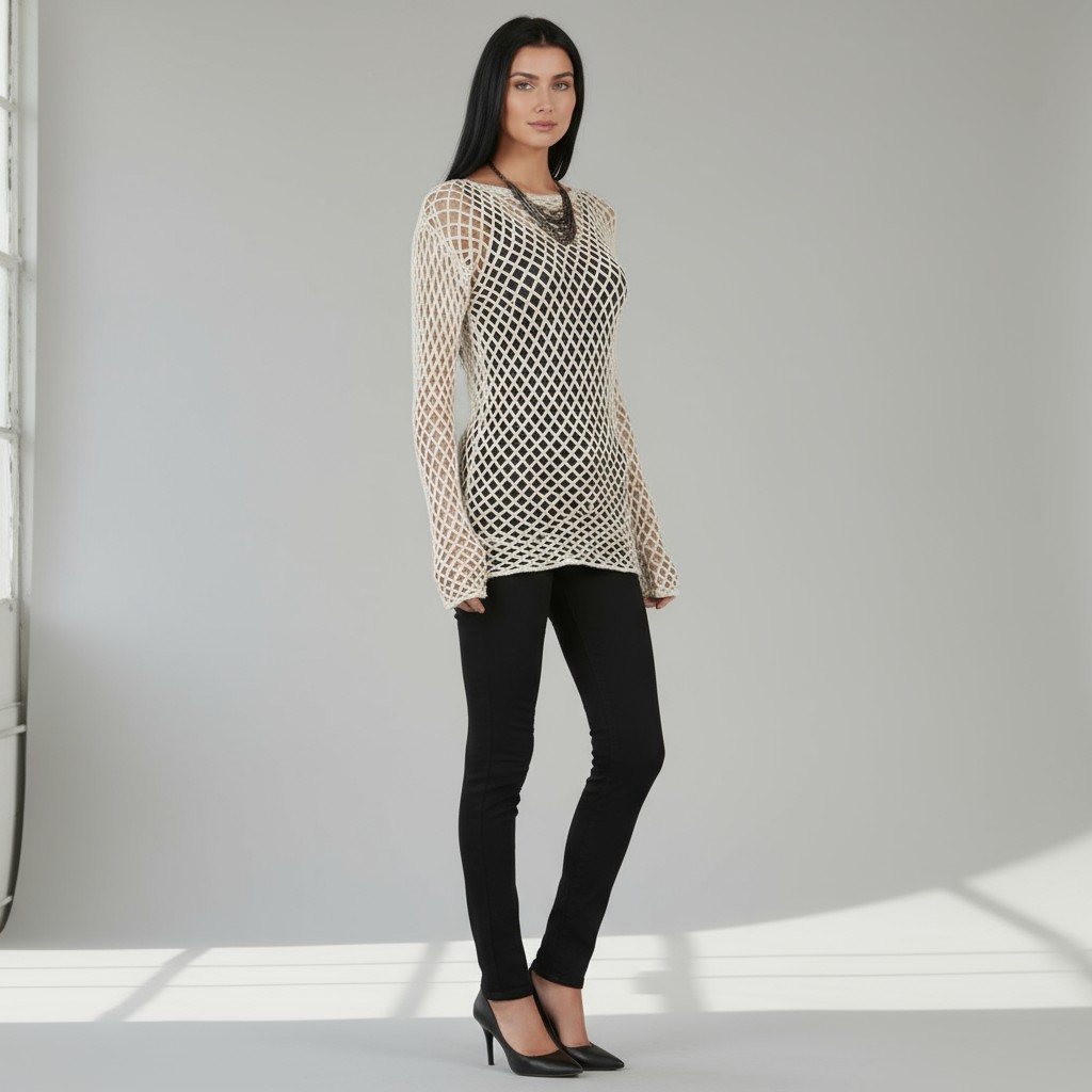 This Fish-Net Crocheted Top is off-white in color and great for any season. The crocheted top has flared out long sleeves, fishnet pattern and handmade lace around the neck, sleeves and hem. It is light and carefree, ideal for layering. Made of Italian wool, It is pair-able with just about anything and will rock the fashion world.