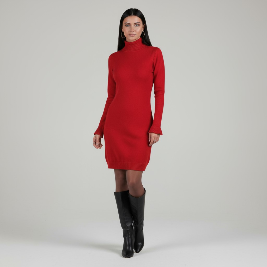 This radiant red ruffle sleeve dress is an extremely stunning piece with it's loose ruffle sleeves, and ribbed turtle neck collar. The delicate charm of this fitted red dress is only made more alluring with the mid-thigh ribbed hem design. The bright red color can play up your femininity as it goes from day-to-night in the blink of an eye.