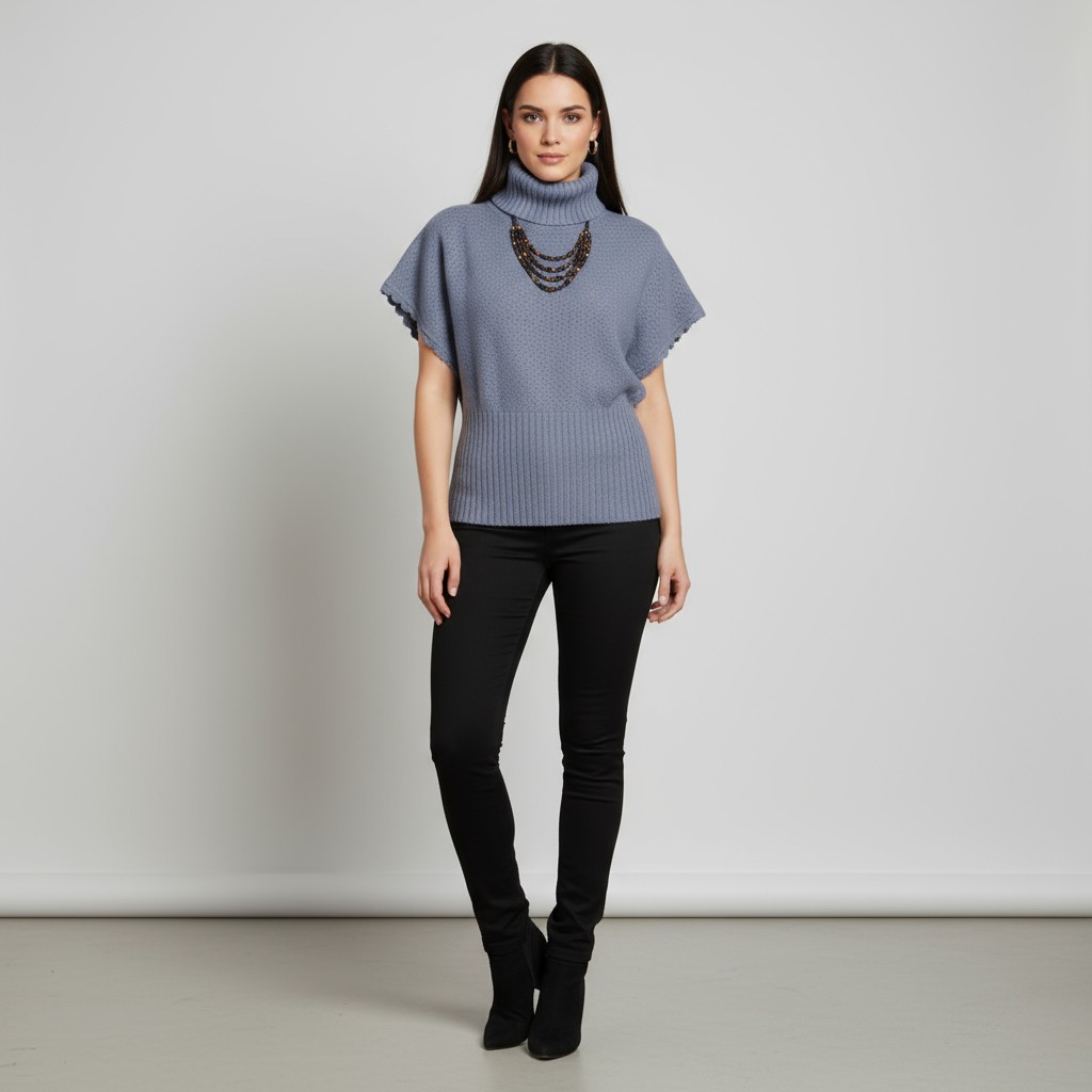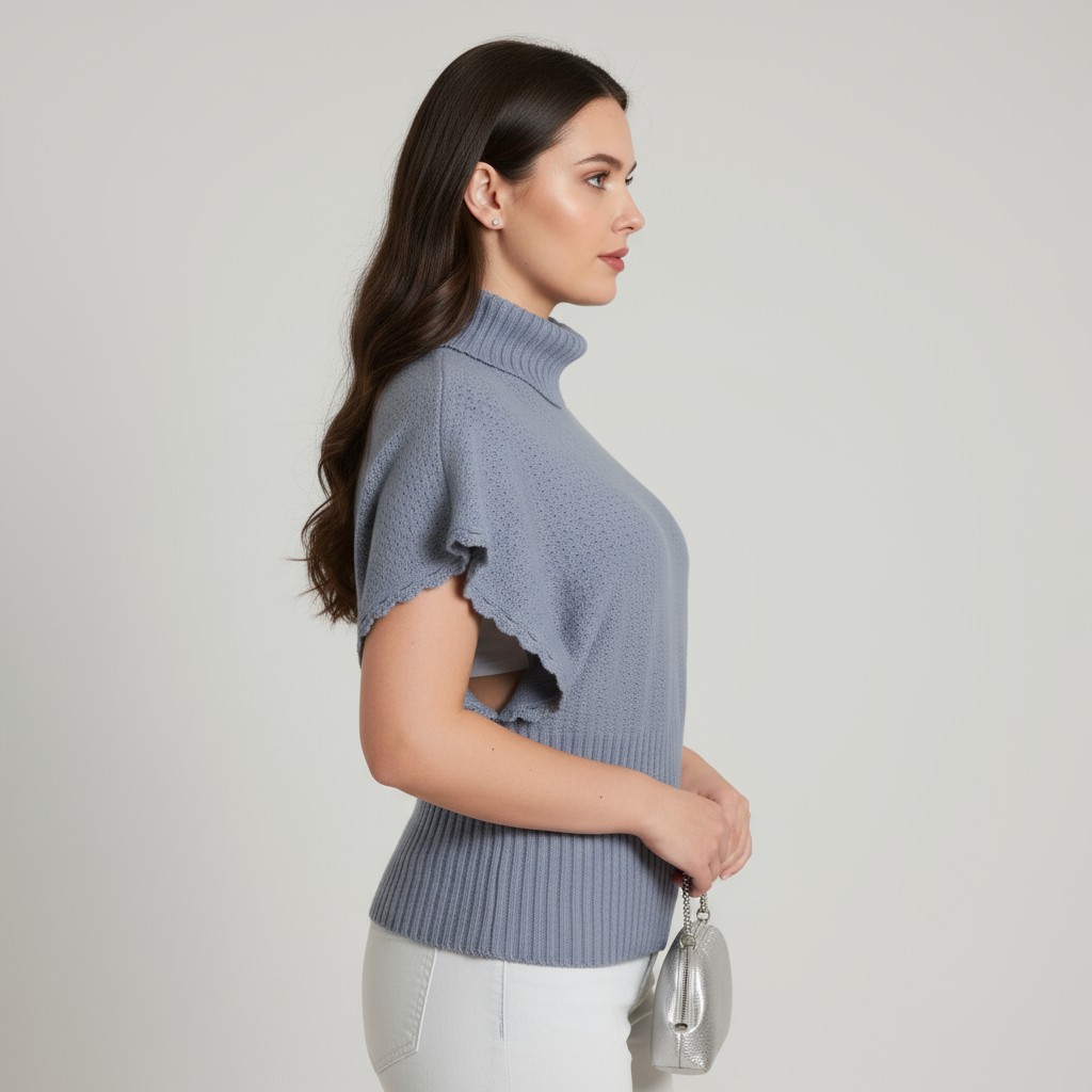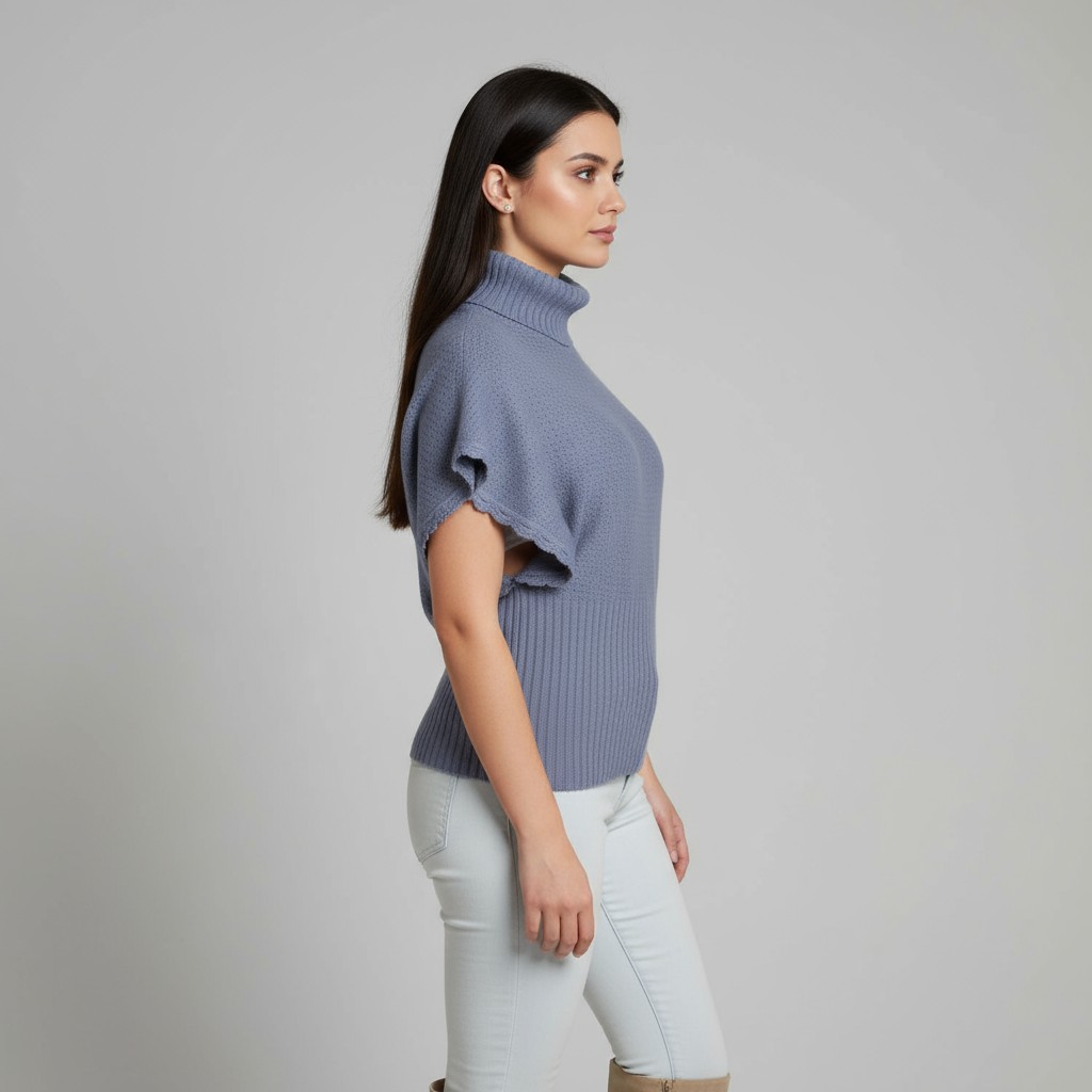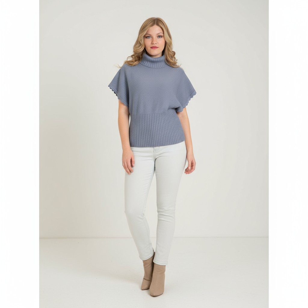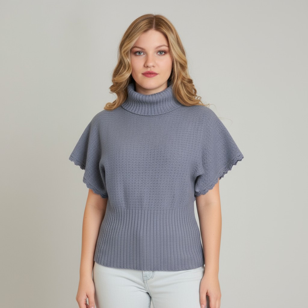 This specific piece, mix of a spring color and fall design is a light violet color, high waist, textured, turtleneck pullover with hand crafted hem around dolmen sleeves that will attract everyone's attention.